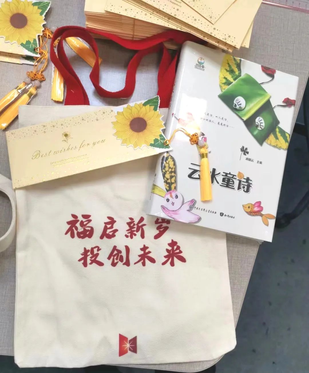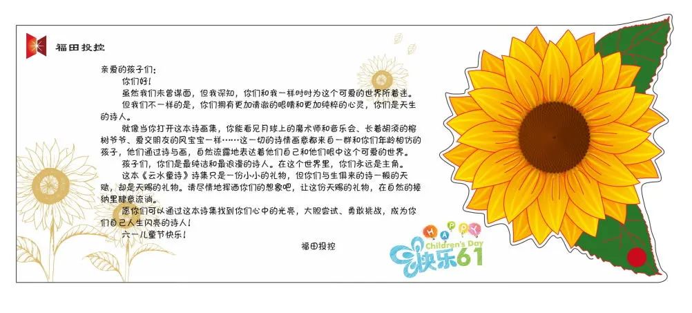 孩子们惊喜的发现,太阳集团tcy8722还在这本充满童趣的诗集中夹入了一封精致的小信笺,有向日葵花纹装饰过的信笺中,用一句句轻言软语鼓励着孩子们:“愿你们可以通过这本诗集找到你们心中的光亮,大胆尝试、勇敢挑战,成为你们自己人生闪亮的诗人!”