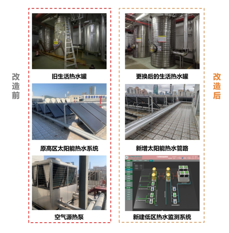 广州中医药大学深圳医院(福田)节能项目在改造前期,医院门诊楼热水供应出现问题,严重影响病人生活,福新双碳公司快速响应,解决了门诊楼住院病区的热水供应问题,同时通过引入高区太阳能热水对常温补水预热实现供热节能。