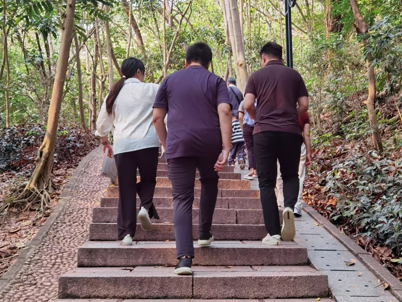 谈笑间,青年职工们兴致勃勃地向山顶攀登,大家欢声笑语,挥洒着汗水。微风吹来,树叶涌动,如同绿浪翻滚,更让人心旷神怡。