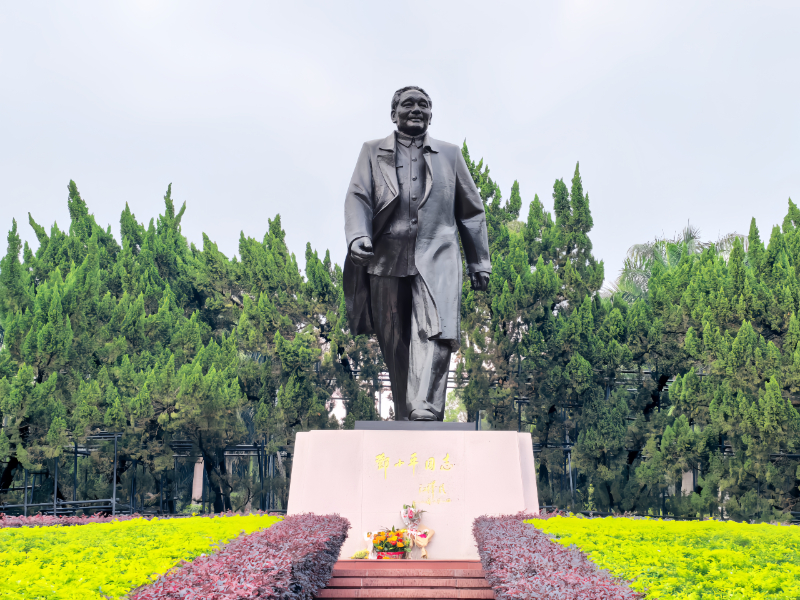 顺着山路蜿蜒而上,青年职工们终于来到了莲花山顶。这里矗立着全国第一座由中央批准,以城市雕塑形式竖立的邓小平雕像。10米高的铜像步伐坚定,衣襟飞扬,传递出“改革开放步子要大”的精神。