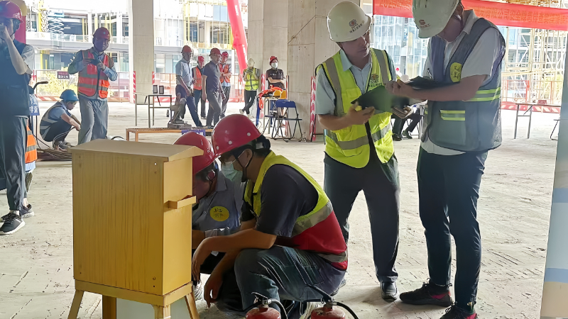 在个人防护用品穿戴演练中,参赛人员动作迅速规范,选择正确且合格的安全带、安全帽及反光背心进行穿戴;在灭火逃生演练中,参赛人员沉着冷静,正确穿戴逃生防毒面具并选择合适的灭火器,成功扑灭模拟火源并安全逃生。